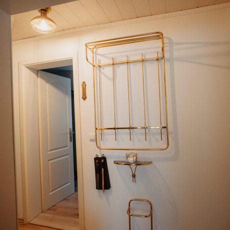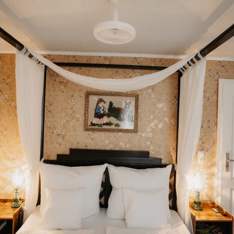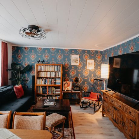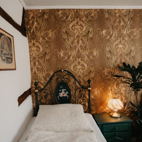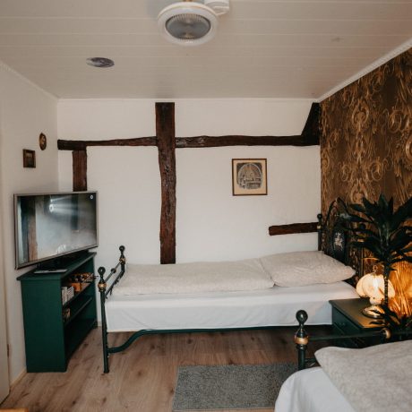 Im ersten Schlafzimmer mit Fenster zum Innenhof können sie königlich schlafen in einem majestätischen Himmelbett. Gegenüber befindet sich das Bad, modern mit begehbarer Dusche. Das Wohnzimmer mit gemütlicher Sitzecke, Bibliothek mit über 400 Büchern, Schallplattenspieler, Gesellschaftsspielen und einem riesigen Fernseher mit Wii Konsole lässt keine Langeweile aufkommen. Vom Wohnzimmer kommt man gleich in das zweite Schlafzimmer mit zwei Einzelbetten. Eine Mischung aus altem Bauernschrank und rustikalen Betten wird der Raum in Gold und Grün gehalten.