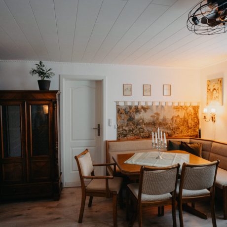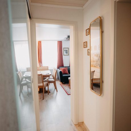 Die Küche befindet sich gleich links in der Wohnung und ist komplett ausgestattet von Elektro-Geräten bis zum Geschirr und Gewürzen. Die Ferienwohnung bietet Platz für vier Personen und mit Aufbettung im Wohnzimmer auf einer breiten Schlafcouch sogar bis zu sechs Gästen.