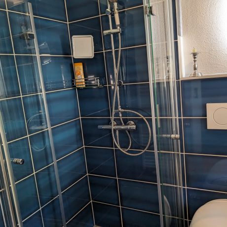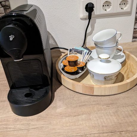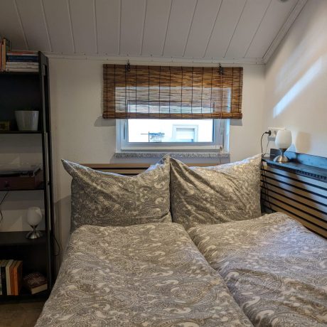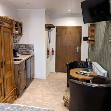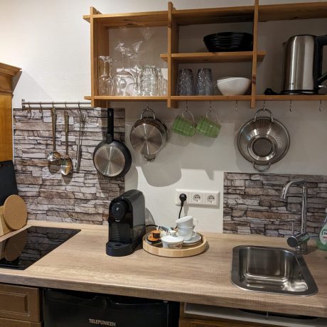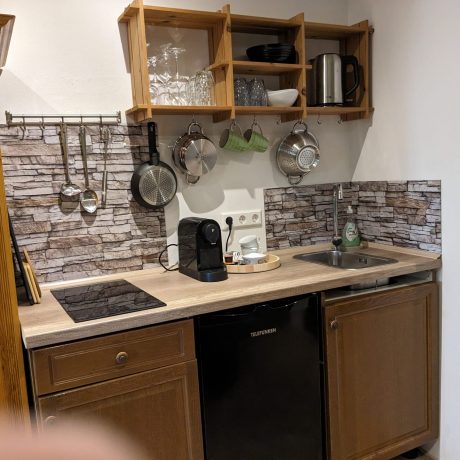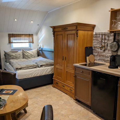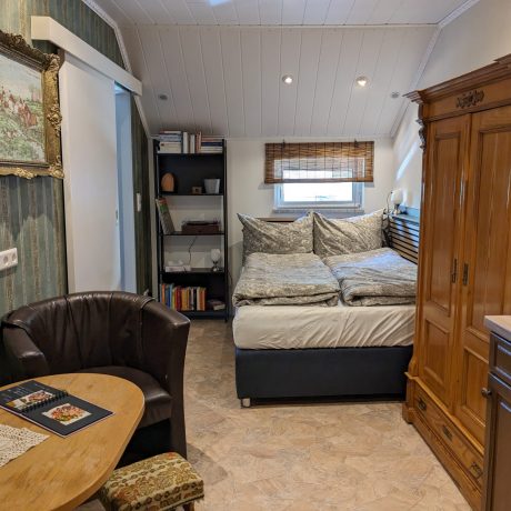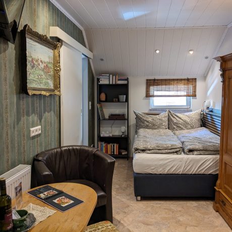 Das Doppelzimmer (Weinrebe) klein und gemütlich bietet alles, was man braucht für einen Urlaub. Schlafen, wohnen, kochen – an alles ist gedacht. Gleich im Eingangsbereich befindet sich die Garderobe und gleich rechts eine kleine Kochnische. Die Kochecke verfügt über alles was man benötigt, von Kaffeemaschine bis hin zum Kochfeld. Unterm Fenster steht das gemütliche Bett. Ein Schrank und eine Sitzgelegenheit vervollständigt das Raum. Zu Unterhaltung ist ein Fernseher, Bücherregel, Musikanlage vorhanden. Das Badezimmer mit Tageslichtfenster ist modern ausgestattet- ebenerdige Dusche. Für das Raumklima sorgt eine moderne Klimaanlage für frische Luft, kühl im Sommer, warm im Winter.